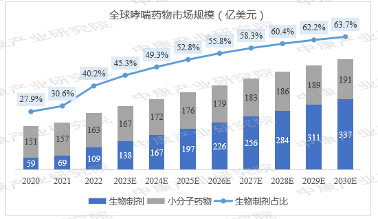 根据弗若斯特沙利文报告,全球哮喘药物市场规模将以年复合增长率8.6%,从2022年的272亿美元增长至2030年的528亿美元,而生物药增幅将超越化药,到2030年市场份额将达63.7%。