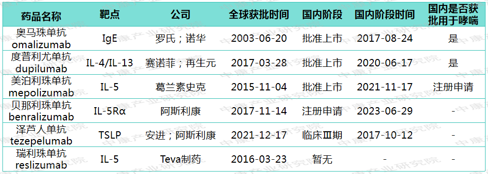 目前,全球获批上市的哮喘治疗靶向生物制剂共6款,其中奥马珠单抗、度普利尤单抗及美泊利珠单抗已在国内获批,而美泊利珠单抗的新适应症-重度嗜酸粒细胞性哮喘申请已获得CDE受理。这些药物作用靶点集中在IgE、IL-5/IL-5R、IL-4/IL-13与TSLP。