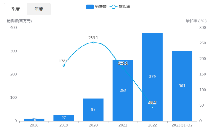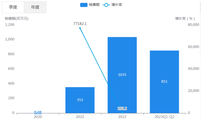 度普利尤单抗是一款由赛诺菲和再生元联合开发的IL-4/IL-13单抗,目前已获得多个适应症,包括治疗中重度特应性皮炎、慢性鼻-鼻窦炎伴鼻息肉、以及特定年龄段的哮喘和特应性皮炎等。自2020年在中国上市以来,度普利尤单抗销售额逐年上升,2022年国内等级医院销售额达10.35亿元,同比增长193.2%;2023年上半年市场继续放量,已达8.51亿元。