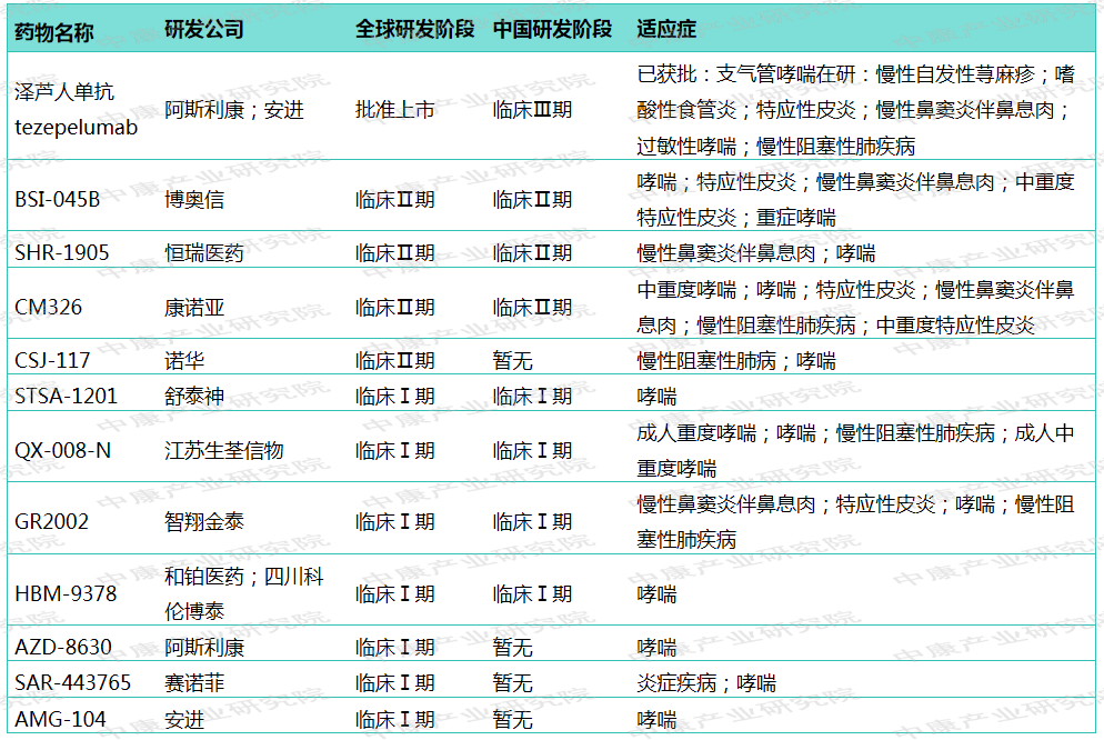 目前已有多款TSLP靶向药物进入临床阶段,国内药企有恒瑞、康诺亚、博奥信、舒泰神、江苏生荃信物等积极布局。