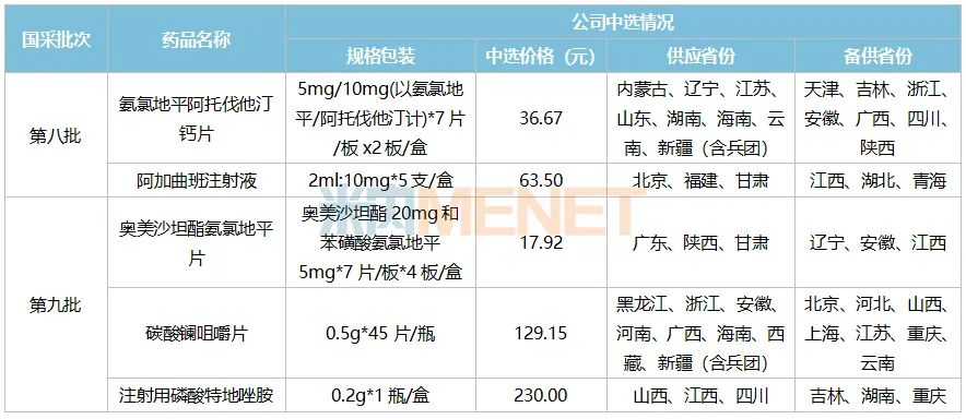 南京正大天晴制药从联盟扩围阶段便积极参与国家集中带量采购,前九批(不含第六批胰岛素专项)已中标了厄贝沙坦氢氯噻嗪片、瑞舒伐他汀钙片、奥美沙坦酯片、替格瑞洛片、注射用盐酸吉西他滨、碘克沙醇注射液、碘帕醇注射液、阿加曲班注射液、氨氯地平阿托伐他汀钙片、奥美沙坦酯氨氯地平片、碳酸镧咀嚼片、注射用磷酸特地唑胺共12个产品。