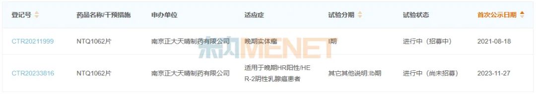 2023年9月该新药的第二个适应症获批临床,联合氟维司群用于标准治疗失败的局部晚期或转移性HR阳性/HER-2阴性乳腺癌。资料显示,NTQ1062片为AKT抑制剂。米内网数据显示,NTQ1062片“用于晚期HR阳性/HER-2阴性乳腺癌”适应症已在今年11月启动I期临床。