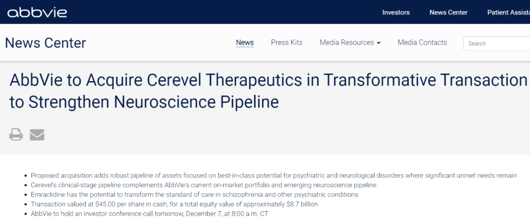 12月7日,艾伯维宣布已与Cerevel Therapeutics达成最终协议,将以每股45美元的价格现金收购Cerevel Therapeutics,总股权价值约为87亿美元。完成收购后,艾伯维将收获Cerevel Therapeutics公司强大的神经科学管线,包括具有治疗精神分裂症、帕金森病以及情绪障碍等多种疾病的潜力候选药物。