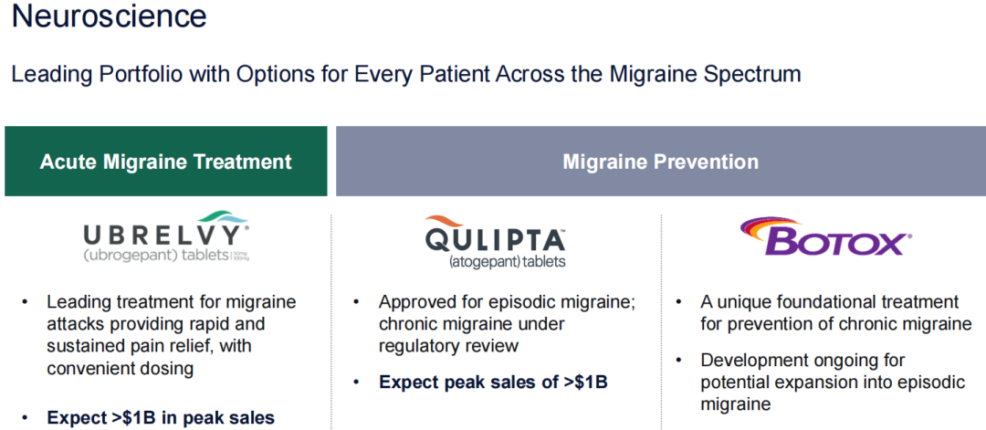 神经科学是艾伯维主要聚焦的疾病领域之一,其中偏头痛是艾伯维神经科学布局最全面的细分领域,Ubrelvy(ubrogepant)、Qulipta(atogepant)两款产品覆盖了急性发作以及预防偏头痛人群。艾伯维预计前两款产品均有望达到10亿+美元的销售峰值。