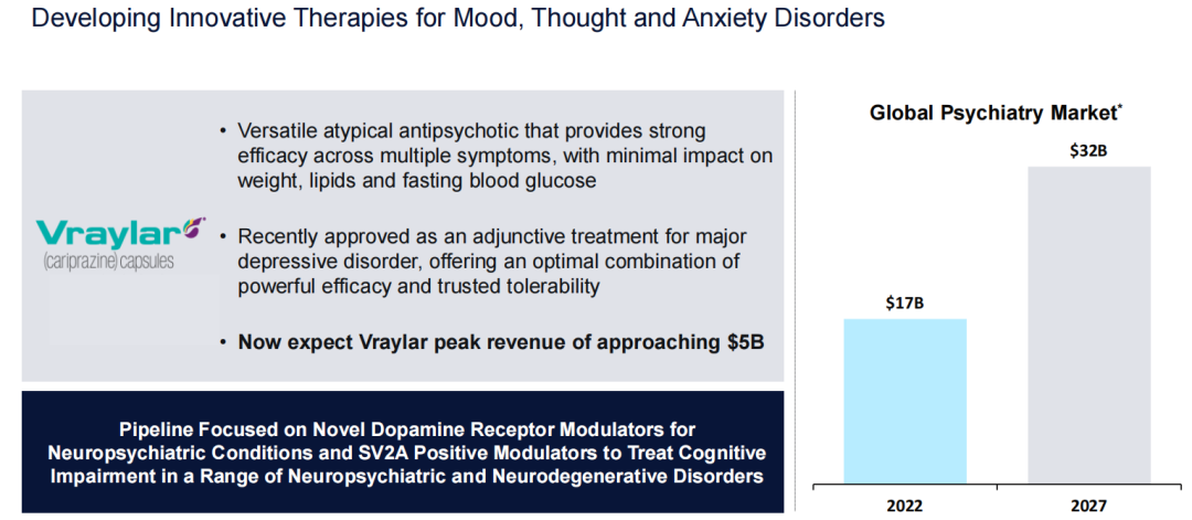 Vraylar(cariprazine)是一款多功能非典型抗精神病药,对多种症状具有强大的疗效并且对体重、血脂和空腹血糖的影响很小。该产品已获FDA批准作为重度抑郁症的辅助治疗。艾伯维预计该产品2027年销售额将达到32亿美元,销售峰值有望达到50亿美元。