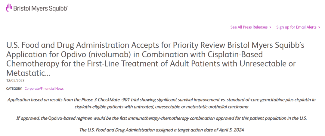 12月5日,百时美施贵宝(BMS)宣布纳武利尤单抗(Opdivo,O药)联合顺铂化疗一线治疗不可切除或转移性尿路上皮癌(UC)成人患者的补充生物制品许可申请(sBLA)获FDA受理并予以优先审评,PDUFA日期定为2024年4月5日。此前,O药已获批单药治疗接受铂类化疗中/后疾病进展的UC患者和单药辅助治疗复发风险高的UC患者。