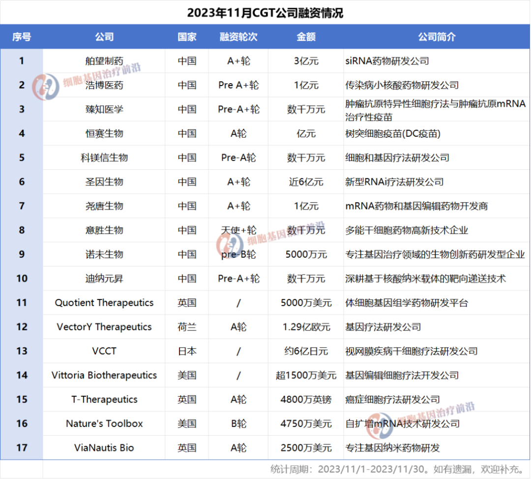 据不完全统计,仅11月份,国内外CGT领域就发生17起融资,融资总金额近40亿人民币。具体如下: