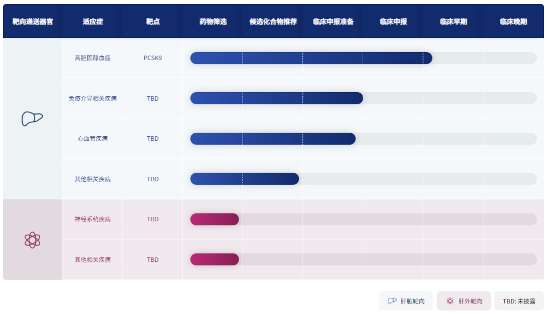 舶望制药成立于2021年4月,由数位siRNA药物开发经验丰富的科学家创立,最新年报显示位于上海张江,公司专注于新一代siRNA药物的开发。舶望制药已有4条管线处于临床阶段,1条管线即将进入临床,适应症领域涵盖心血管疾病、罕见病、乙肝、自身免疫、神经系统疾病等,已在中国、美国、澳洲等多地获得临床批件。