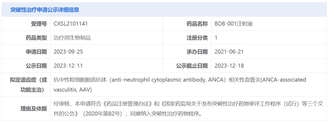 [2]BDB-001注射液治疗ANCA相关性血管炎持续招募中!. Retrieved Mar 31, 2021. From https://mp.weixin.qq.com/s/0O55HQuslxC1l5-5eeXsrw