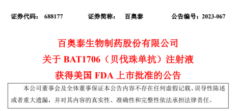 12月8日,百奥泰发布公告,公司于近日收到了美国FDA签发的关于生物类似药贝伐珠单抗注射液(BAT1706)(美国商品名称:Avzivi®)上市批准的通知。这是百奥泰继托珠单抗之后第二个获得美国 FDA 上市批准的产品。