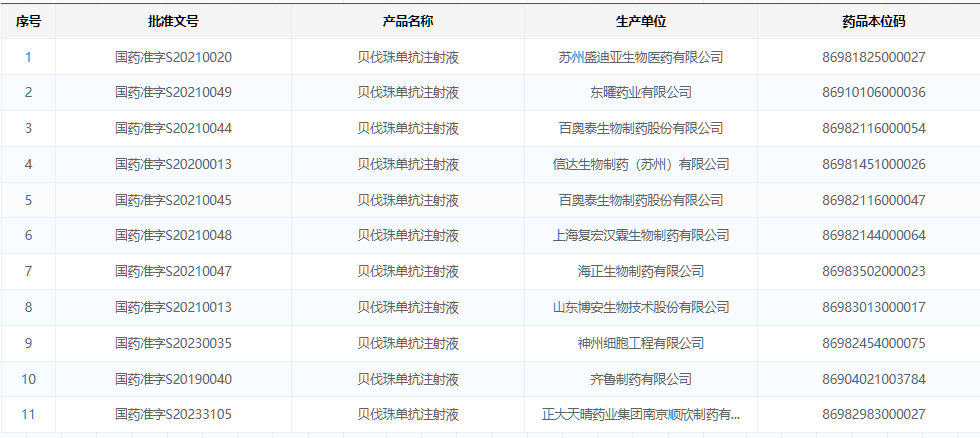 2018年,贝伐珠单抗在中国的专利保护到期。2019年12月国内第一家贝伐珠单抗生物类似药获批上市,为齐鲁制药的安可达。截至目前,国内获批上市的贝伐珠单抗共计11款,包括罗氏的贝伐珠单抗原研,以及10款国产贝伐珠单抗生物类似药,竞争十分激烈。