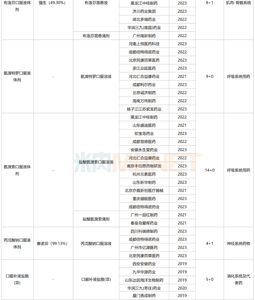 地氯雷他定口服液体剂、氨溴索口服液体剂均为呼吸系统领域的口服液体剂,目前符合申报资格企业数分别达15家、14家。在第九批集采正式名单尚未发布之前,这2个品种就已达到集采的门槛,但最终未被纳入。目前已纳入国家集采的呼吸系统化药中,尚未出现口服液体剂的影子。