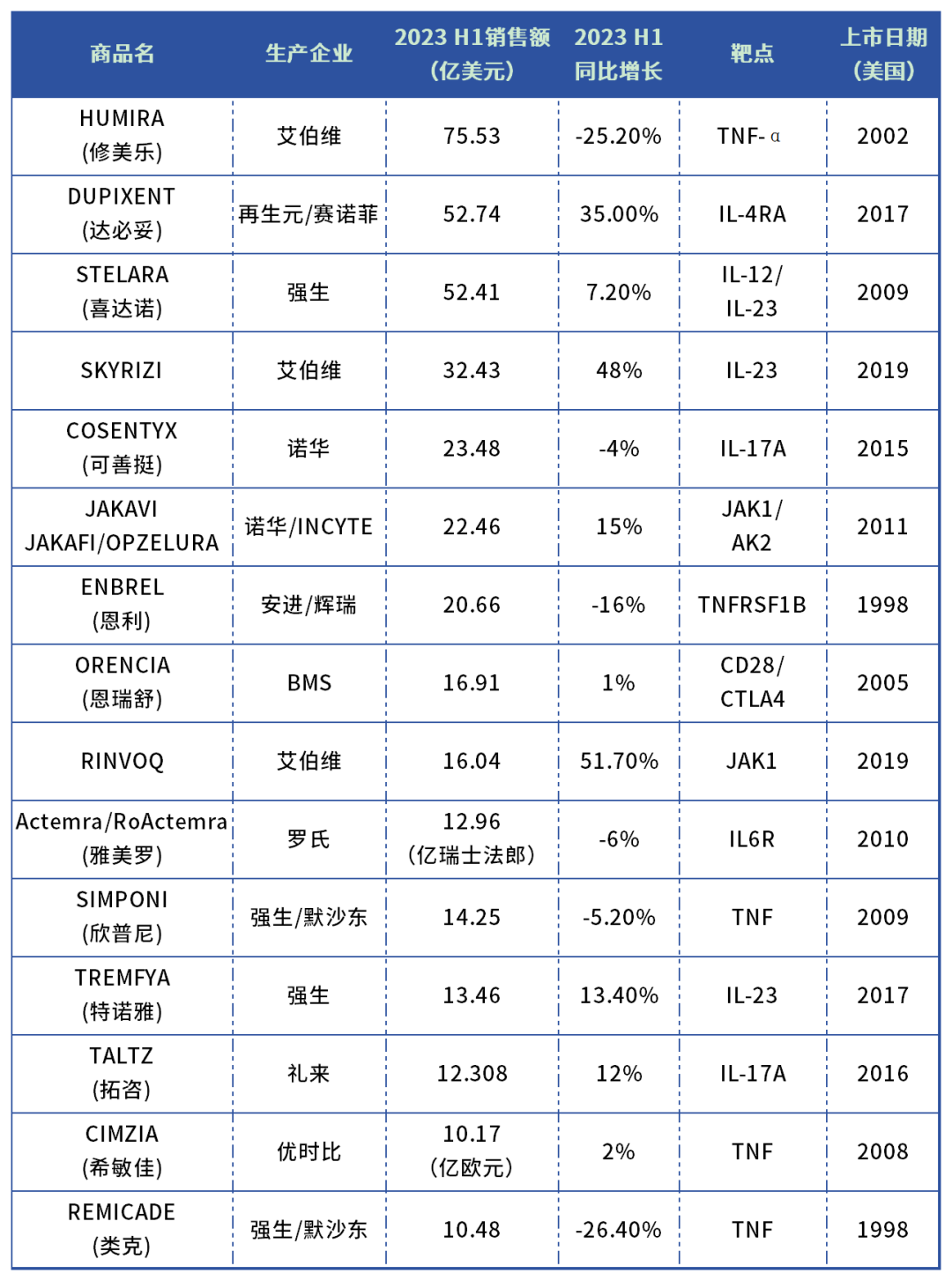 为了弥补修美乐即将到来的下滑,艾伯维推出了两颗“超新星”:JAK (upadacitinib,乌帕替尼)抑制剂Rinvoq和 IL-23 抑制剂 Skyrizi (risankizumab,瑞莎珠单抗)。但今时不同往日,自免市场百花齐放,重磅单品频出,艾伯维想要复制修美乐的成功已不太可能。