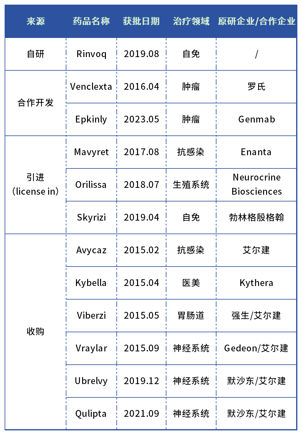 艾伯维自成立以来通过并购与合作引进不断拓展业务。从结果来看,“买买买”确实丰富了艾伯维的产品管线。2015-2023年,艾伯维共有12个新药获得FDA批准上市,仅Rinvoq一款为自研新药,Venclexta和Epkinly为合作开发,3款来自引进,6款来自收购。