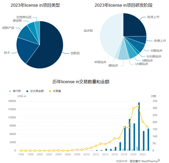 根据医药魔方数据库,2023年,国内共发生了超170笔license in交易,其中2/3交易的转让方是中国企业,其次是美国企业,还有一些来自日本、英国、瑞士等国家,项目类型以创新药和技术的权益引进为主。(注:数据截至发稿日期,本文统计数据包括国内企业之间的授权许可引进和跨境授权许可引进)与往年相比,2023年license in交易数量有所下降,但总金额与2022年基本持平,这主要得益于百济神州、华东医药等公司的大手笔支出。今年,百济神州先后引进了映恩生物的ADC和ensem therapeutics(昂胜医药)的CDK2抑制剂,两笔交易总额均超10亿美元。华东医药继续大力出奇迹,与科济药业、Scohia、三优生物、Arcutis等8家公司签署合作协议,涉及细胞疗法、GLP-1药物和多款医美产品。