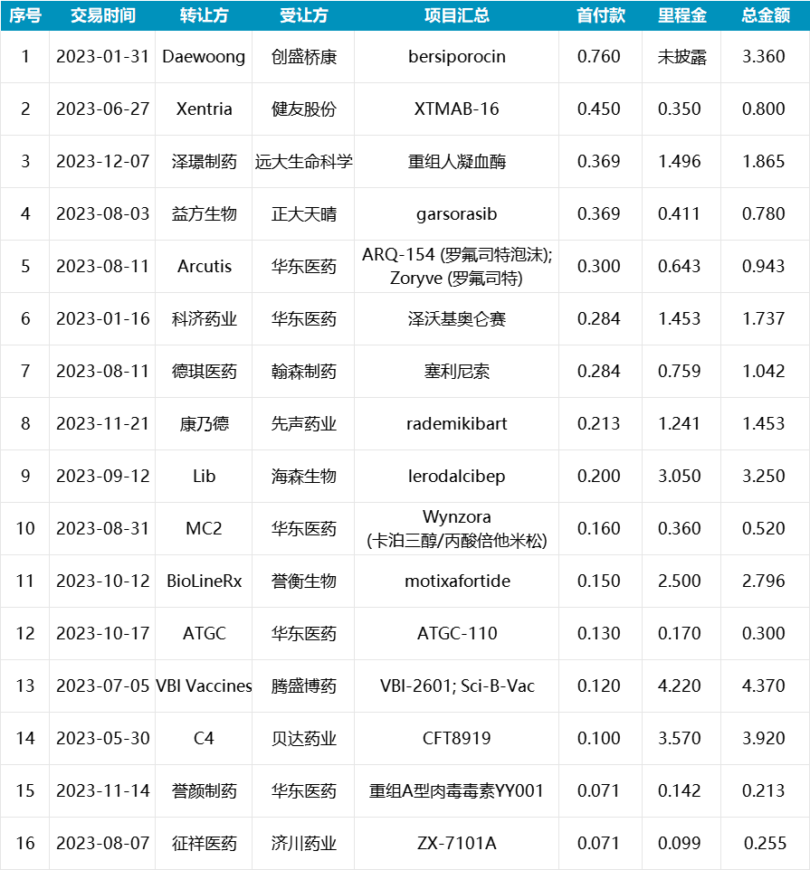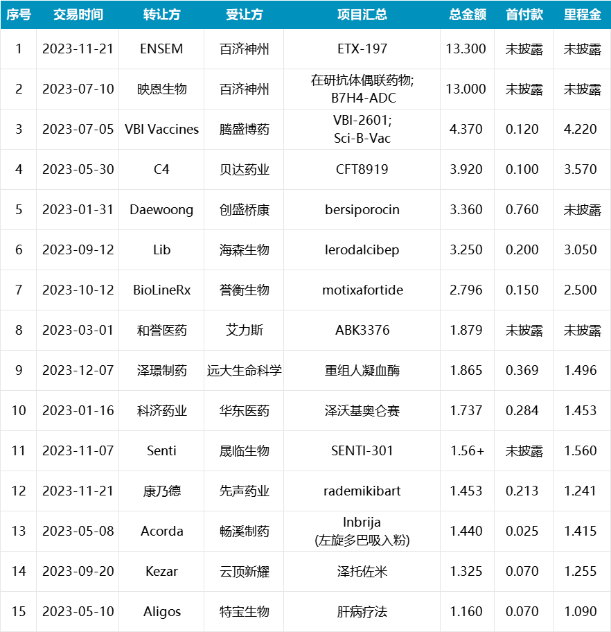 2023年中国创新药license in交易TOP15 (按总金额计,单位:亿美元)