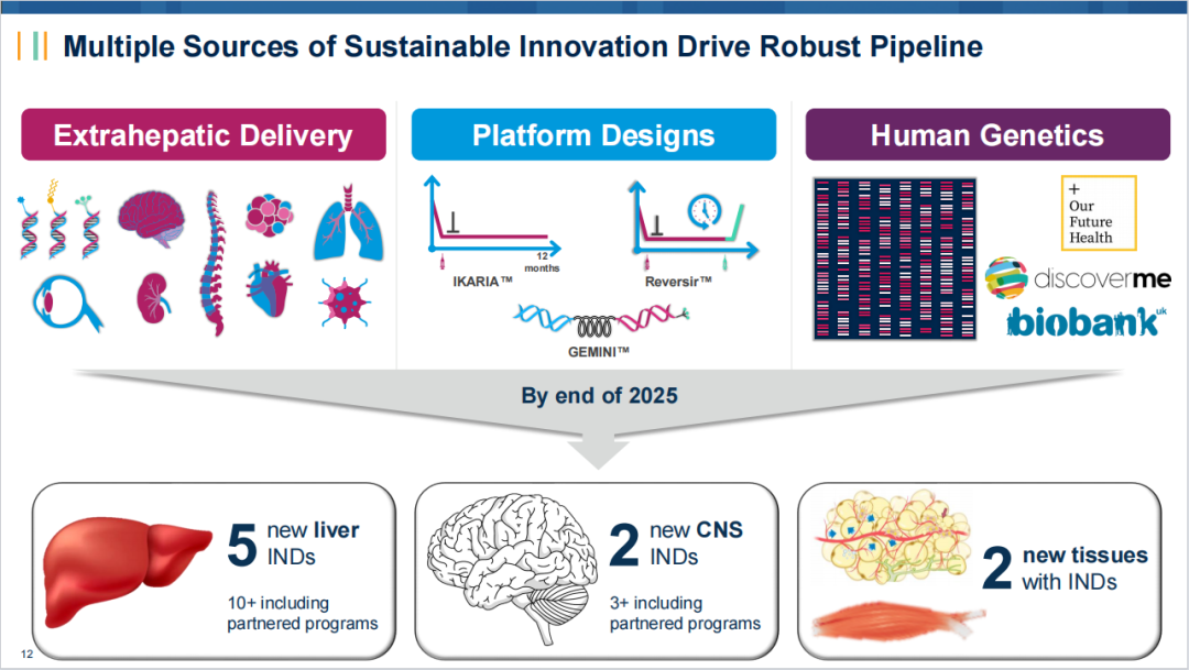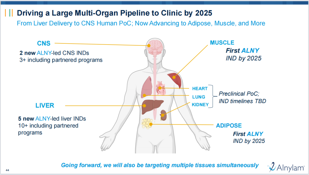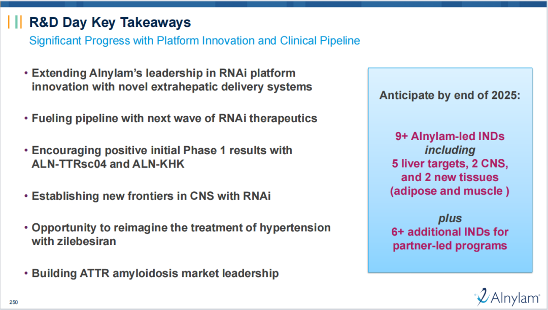 到2025年底,公司计划为至少9个由Alnylam主导的新RNAi项目提交研究性新药(IND)申请,其中5个用于肝脏靶向、2个用于中枢神经系统(CNS)靶向、1个用于脂肪组织靶向、1个用于肌肉靶向。
