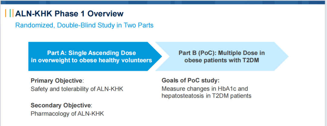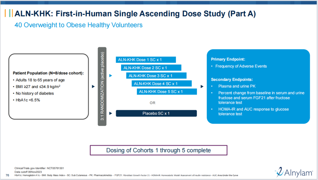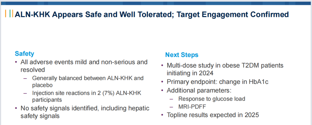 ALN-KHK是一款靶向酮己糖激酶(KHK)的在研RNAi疗法,用于治疗2型糖尿病。在超重至肥胖健康志愿者的Ⅰ期研究中,在可用的最高剂量队列中单剂量研究性 ALN-KHK 导致曲线下果糖面积相对于第85天测量的基线水平平均增加至3倍,为目标参与提供了明确的证据。另外,研究还观察到循环FGF21水平的降低,这与KHK的已知生物学一致。公司计划在2024 年年初启动该药物的ⅠB期研究部分。