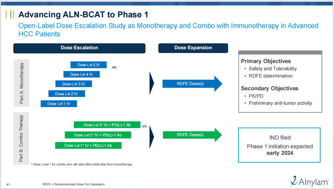 ALN-BCAT是一种研究性RNAi治疗靶向β-catenin,用于治疗肝细胞癌(HCC)。其采用Alnylam先进的脂质纳米颗粒(LNP)递送技术,称为“reLNP”,由于增强了生物降解性,该技术提供了更高的耐受性。Alnylam表示其近期将提交该药物的IND申请,并计划在2024年初启动Ⅰ期临床研究,该研究将评估研究药物作为单一疗法和与免疫疗法联合治疗晚期疾病患者的潜力。