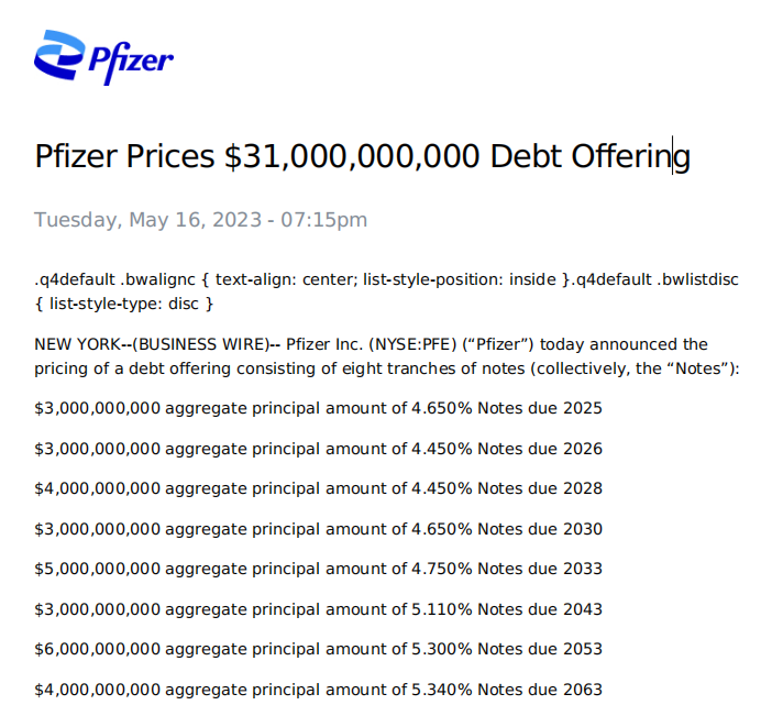 5月,辉瑞宣布了由8批票据组成的债务发行定价,利率由4.450%—5.340%不等,票据到期从2025年—2063年。该票据将由辉瑞全资子公司Pfizer Investment Enterprises Pte. 发行。此次发行的净收益将用作辉瑞拟收购Seagen融资的一部分。如果合并终止或未在约定日期前完成,除10年期票据和30年期票据的发行外,该票据将进行特别强制赎回(价格等于该系列票据本金总额的101%)。