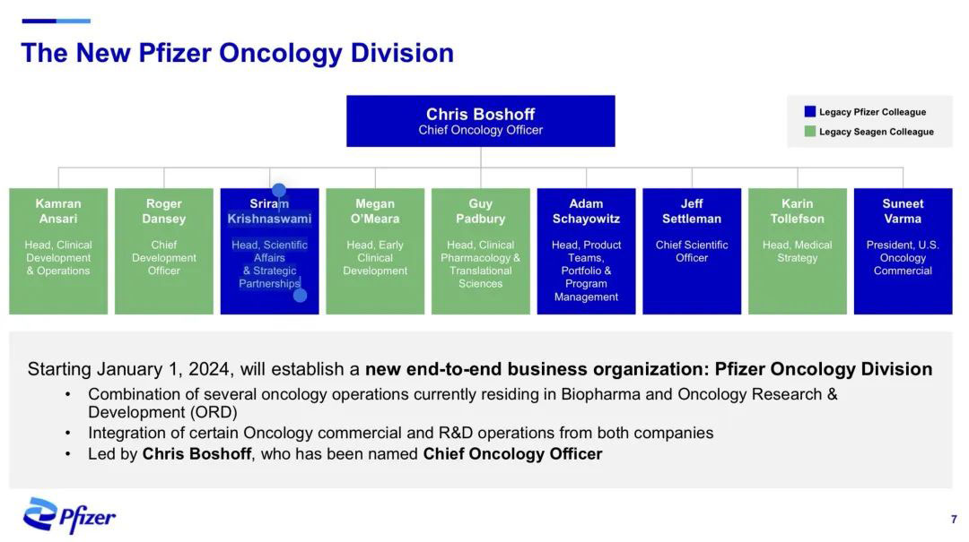 具体而言,2024年1月起,辉瑞将创建一个新的“辉瑞肿瘤部门”,整合两家公司的部分肿瘤产品商业和研发,并设置为端到端业务组织,由即将担任首席肿瘤业务负责人、执行副总裁的Chris Boshoff博士领导,直属于董事长兼CEO Albert Bourla管理。