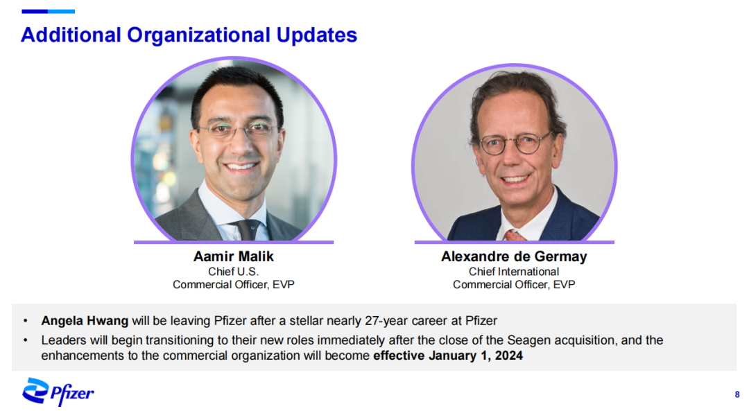 此外,非肿瘤商业组织将被拆分为两大业务部门:辉瑞美国商务部和辉瑞国际商务部,分别直属董事长兼首席执行官Albert Bourla博士管理。辉瑞美国商务部将由Aamir Malik领导,他将担任首席美国商务官兼执行副总裁;辉瑞国际商务部将由Alexandre de Germay领导,他将加入辉瑞担任首席国际商务官、执行副总裁。