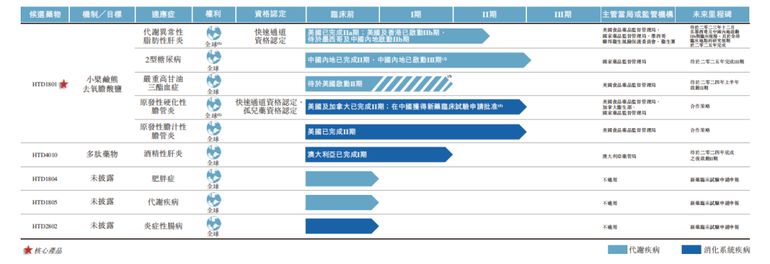 核心产品HTD1801(小檗硷熊去氧胆酸盐)是一种新分子实体,作为肠肝抗炎及代谢调节剂,靶向调节对人体代谢过程中至关重要的多个通路,包括与代谢及消化系统疾病相关的通路。HTD1801布局了2型糖尿病、非酒精性脂肪性肝炎(NASH)等五大适应症。目前HTD180用于治疗2型糖尿病的临床试验已进入3期。