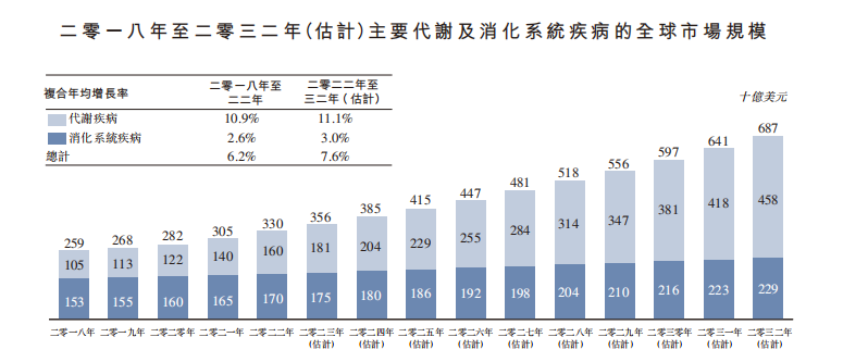 据其招股书资料显示,2025年主要代谢及消化系统疾病的全球市场规模将达到4150亿美元,2030年将高达5970亿美元。