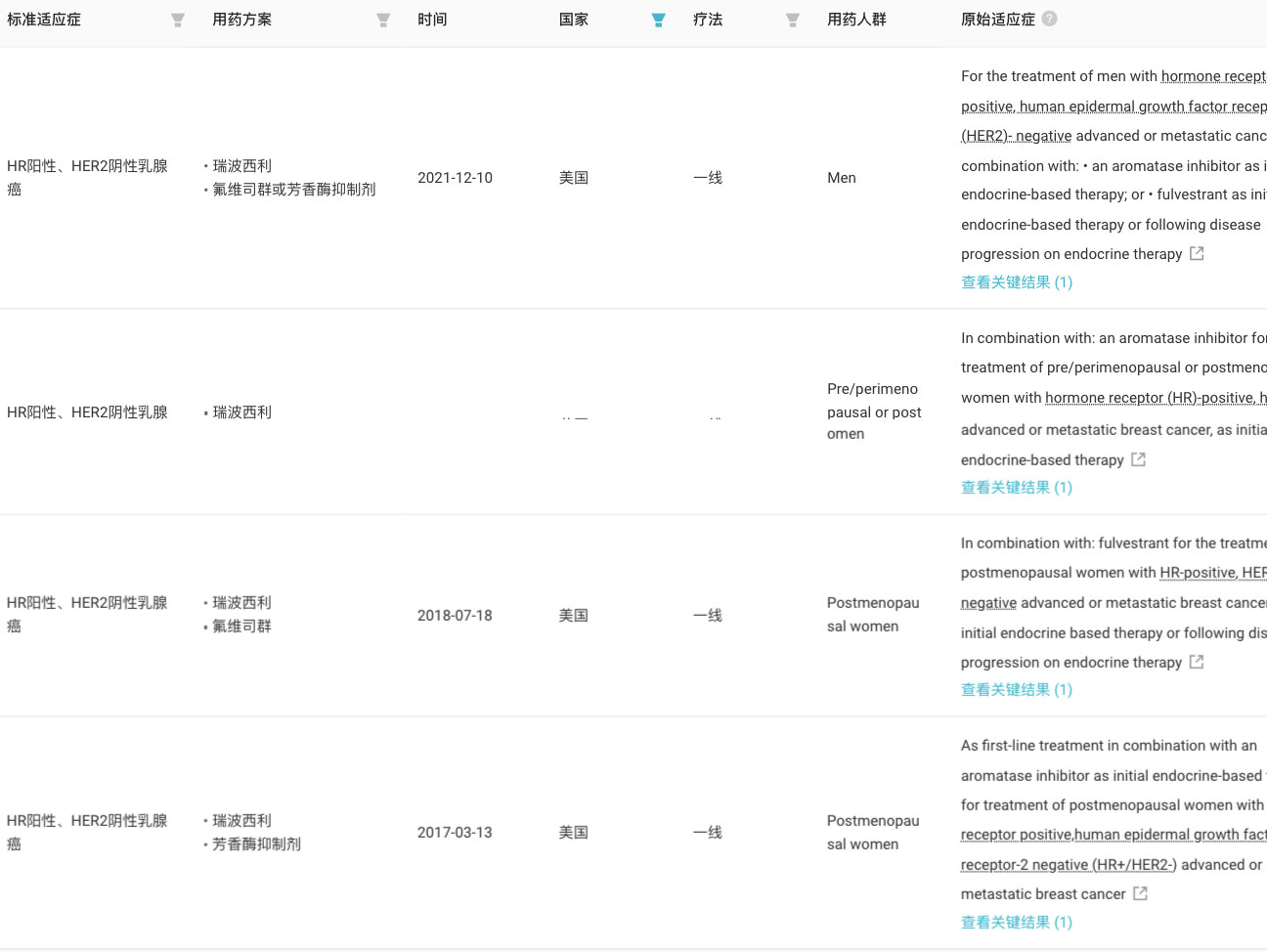 在国内,Ribociclib 在 2021 年 10 月首次申报上市,并于今年 1 月首次获批上市,作为 HR+/HER2- 局部晚期或转移性乳腺癌绝经前或围绝经期女性患者的初始内分泌治疗,使用内分泌疗法治疗时应联用黄体生成素释放激素(LHRH)激动剂。此后,又在今年 5 月获批一线治疗 HR+/HER2- 绝经后晚期乳腺癌。