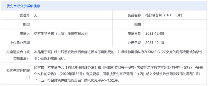 12 月 18 日,据 CDE 官网显示,益方生物 KRAS G12C 靶向药物格舒瑞昔片(D-1553 片)拟纳入优先审评,用于既往经一线系统治疗后疾病进展或不可耐受的、并且经检测确认存在 KRAS G12C 突变的局部晚期或转移性非小细胞肺癌的治疗。