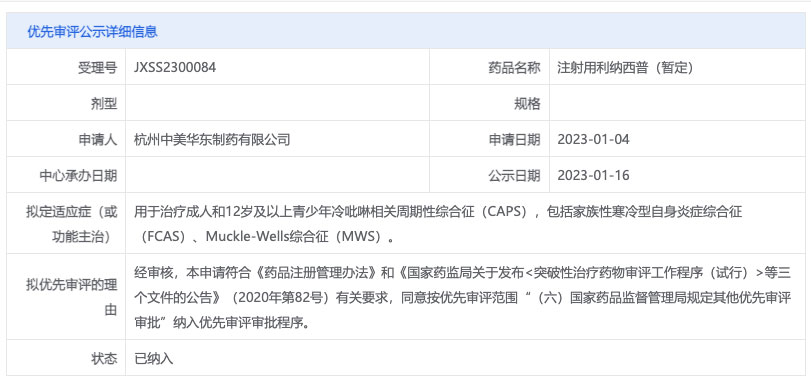 此前,已申报上市,并于今年 1 月纳入优先审评,用于治疗成人和 12 岁及以上青少年冷吡啉相关周期性综合征(CAPS),包括家族性寒冷型自身炎症综合征(FCAS)、Muckle-Wells 综合征(MWS)。