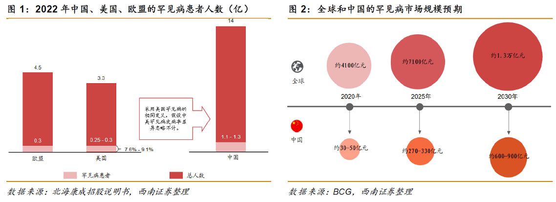 国内存在大量未被满足的患病群体,罕见病市场存在较大的市场增长空间。2020 年全球罕见病市场规模约为 4100 亿元,中国市场约 30-50 亿元,占比约为 1%。根据 BCG 预测,2030 年全球罕见病市场有望达到 1.3 万亿元,中国罕见病市场份额则有望达到 600-900 亿元,约占全球市场的 5%-7%。