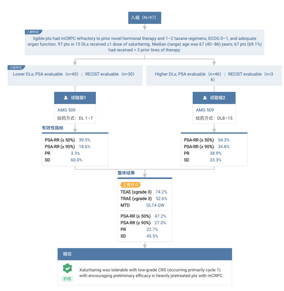AMG 509 刚于今年 6 月在国内首次获批临床,并于今日首次启动临床。在境外,据 Insight 数据库显示,安进当前正在开展一项 AMG 509 治疗去势抵抗性前列腺癌的 I 期临床试验(登记号:NCT04221542)。该试验于 2020 年 3 月启动,预计于 2026 年 6 月完成试验的主要指标。2023 ESMO 大会上公布的中期分析数据已显示出积极结果,详见下图: