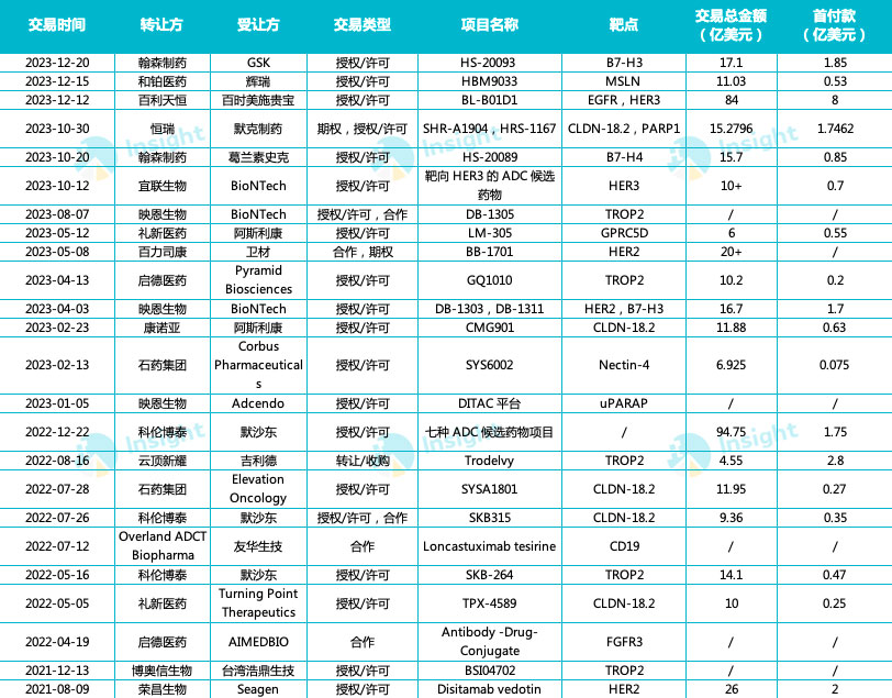 近年来 ADC 领域频发重磅对外授权。当前,据 Insight 数据库显示,近三年已有 24 个 ADC 新药 License out 交易事件,涉及 Claudin 18.2、TROP2、HER2、HER3 等靶点。