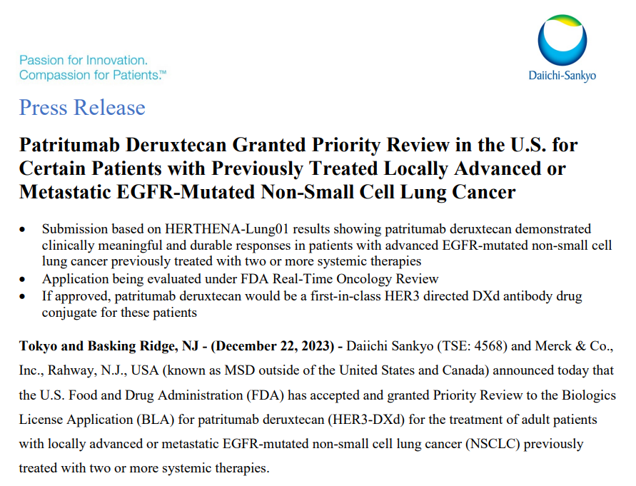 12月22日,第一三共和默沙东共同宣布HER3-DXd(patritumab deruxtecan)的生物制品许可申请(BLA)获FDA受理并予以优先审评,适应症为既往至少接受过两种系统治疗的EGFR突变型局部晚期或转移性非小细胞肺癌(NSCLC),PDUFA日期为2024年6月26日。该产品也是首款申报上市的HER3 ADC。