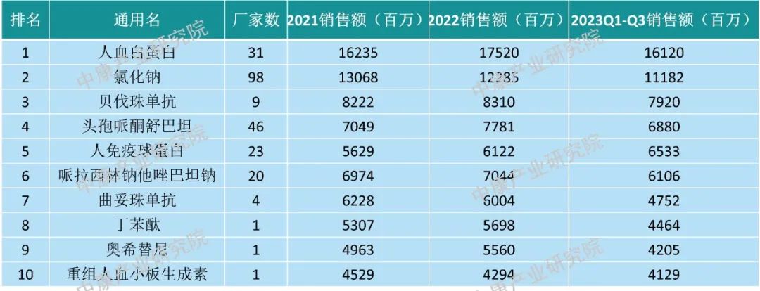 据中康开思数据显示,2023年1-3季度全国等级医院市场的10大主要品种分别为:人血白蛋白(161亿元)、氯化钠(112亿元)、贝伐珠单抗(79亿元)、头孢哌酮舒巴坦(69亿元)、人免疫球蛋白(65亿元)、哌拉西林钠他唑巴坦钠(61亿元)、曲妥珠单抗(48亿元)、丁苯酞(45亿)、奥希替尼(42亿元)、重组人血小板生成素(41亿元)。