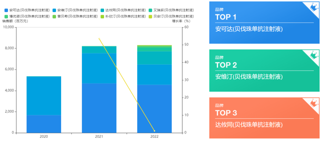 在这份名单里,除了曲妥珠单抗由于在2020年开始有国产生物类似药获批上市,导致市场销售额开始下滑外,其余品种基本都属于稳步上升。