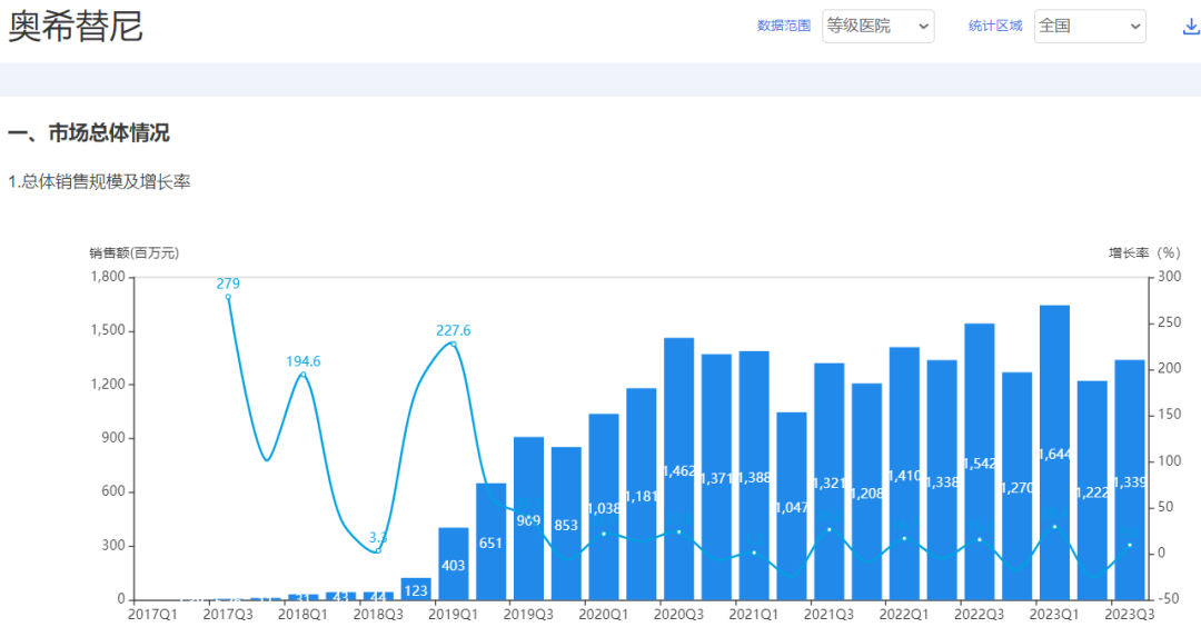 奥希替尼全国等级医院市场总体情况