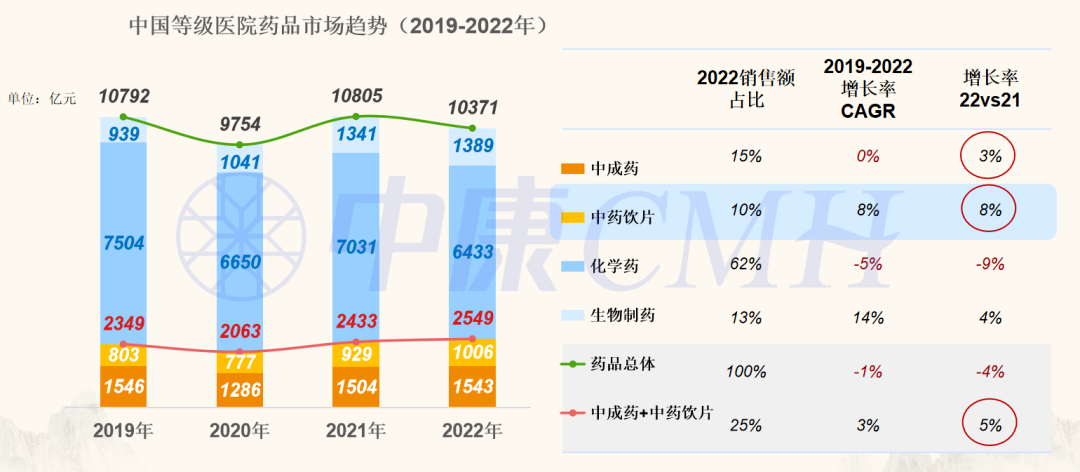在中药方面,据中康CMH数据显示,我国中成药+中药饮片在2022年全国等级医院的药品销售额占比达到25%。其中,2022年中成药同比增长3%,中药饮片同比增长8%。