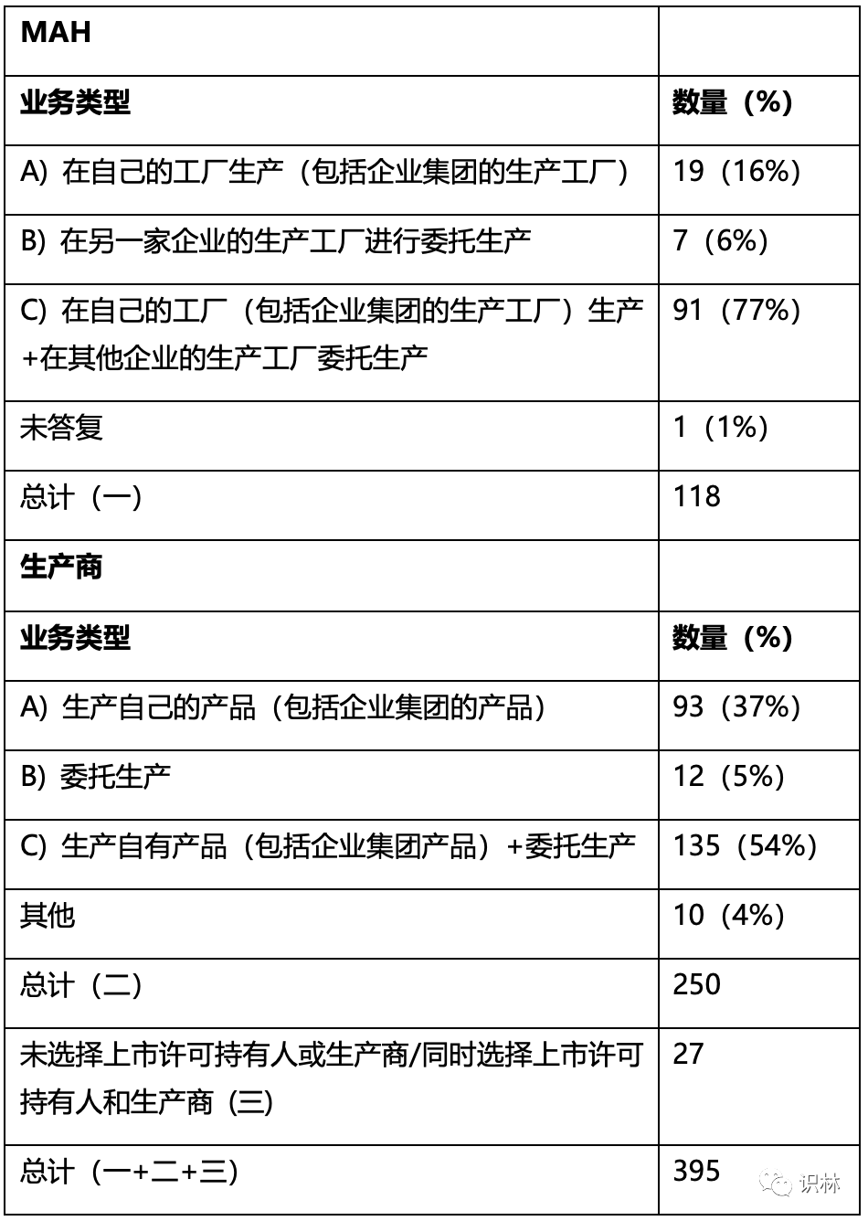 表1. 上市许可持有人(MAH)和生产商的业务类型