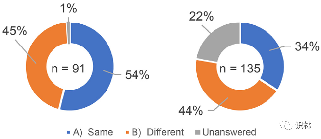 受访者被问及共享知识的范围是否存在差异,具体取决于技术转移目的地/来源是他们自己的企业还是参与合同生产的另一家企业。根据上市许可持有人和生产商的基本数据分析了 226 份回复。在 226 份回复中,上市许可持有人的 91 份回复为“C) 在自己的工厂(包括企业集团的生产工厂)生产+在其他企业的生产工厂委托生产”,来自生产商的 135 份回复为“C) 生产自有产品(包括企业集团产品)+委托生产”(表1)。如图 2 所示,54% 的上市许可持有人(91 名受访者)回答说,自己企业与其他企业在生产方面共享知识的范围“相同”,而 34% 的生产商(135 名受访者)回答“相同”。尽管 22% 的生产商没有给出答案,但总体结果表明,分享知识的人和接受知识的人对共享知识的范围的认识存在差异。