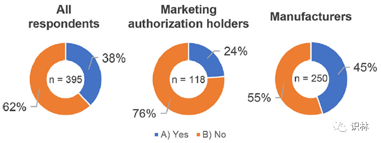 将隐性知识转换为显性知识对于在组织内共享知识非常重要。隐性知识是“基于经验和直觉的、不能轻易用语言表达的知识”,而显性知识是“主要通过句子、图表和数学表达式来解释和表达的知识”。除了分析所有 395 个回复之外,研究还对图 6 中的每个上市许可持有人(118 个回复)和生产商(250 个回复)进行了评估。图 6 显示了个人隐性知识是否已转化为显性知识的调查结果;62%的受访者回答“否”,表明只有少数企业将隐性知识转化为显性知识。此外,根据基础数据对上市许可持有人和生产商的结果进行分析发现,生产商将隐性知识转化为显性知识的比例比上市许可持有人高出20%。