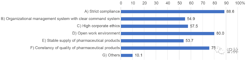 图7展示了培养质量文化的“理想状态”的调查结果,分析了所有 395 份回复。这个问题允许有多个答案。回答“B)有明确指挥系统的组织管理体系”和“E)药品供应稳定”的受访者比例低于选择其他答案的受访者。