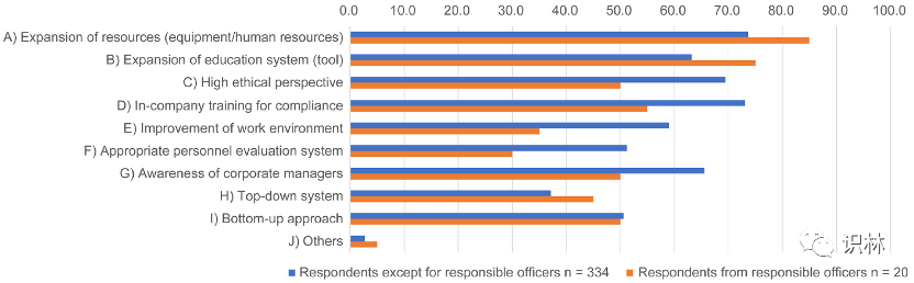 由于培养质量文化是有效 PQS 的前提,正如最近的非法生产案例所表明的那样,研究了制药企业对培养质量文化和 PQS 的看法。研究发现,90% 的受访者(354 名受访者)回答说,仅仅遵循 PQS 的法律和准则无法培养质量文化(图 9)。图 10 显示了他们认为培养质量文化必要条件的调查结果。研究分析了图 9 中 354 个“否”的回答,并提取了其中 20 个(包括负责人的回答)进行比较。结果显示,除“I) 自下而上方法”之外,其他答案存在显著差异(约 8%–24%)。在培养质量文化所需的项目中,“C)高道德观”、“D)企业内部合规培训”、“E)工作环境的改善”、“F)适当的人员评价体系”、“G)企业管理者的意识”表明管理层和员工之间的意识至少有15%的差异。在这两项结果中,员工的意识均高于管理层。