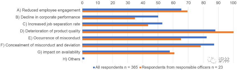 研究对质量文化培养不足的企业风险进行了调查,分析了该问题的所有 395 条回复。在受访者中,98%(388 名受访者)回答质量文化培养不足会引发企业风险(图 11)。对回答“是”的 98%(388 名受访者)进行了分析,如图 11 所示,其中 23 名是负责人。进行比较是为了澄清负责人(23人)和其他受访者(365人)的看法差异。对 365 份回复的分析显示,88.7%、81.2% 和 86.6% 的受访者分别选择“D)产品质量恶化”、“E)发生不当行为”和“F)隐瞒不当行为和偏差”作为企业风险,而 49.2%、52.3% 和 58.0% 的人分别选择“B) 企业业绩下降”、“C) 离职率上升”和“G) 对可用性的影响”(图 12)。此外,研究还比较了包括负责人在内的 23 份答复,结果显示,在“B)企业业绩下降”、“D)产品质量恶化”和“E)发生不当行为”方面,存在显著差异(约 12% 至 17%)。