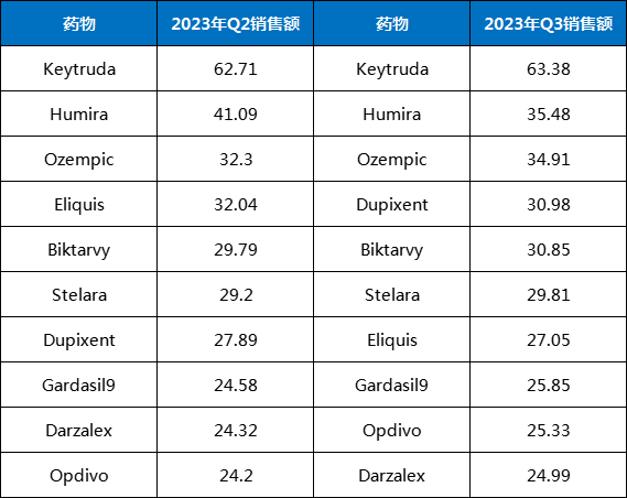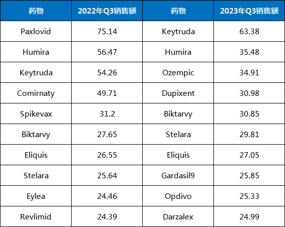 2023年第三季度全球药品销售排名新鲜出炉(表1)。