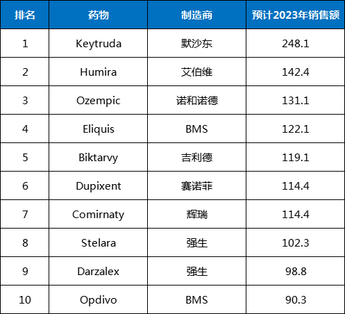 表3 预计2023年药物销售额排名(单位:亿美元)