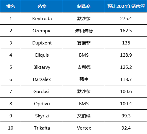 表4 预计2024年药物销售额排名(单位:亿美元)