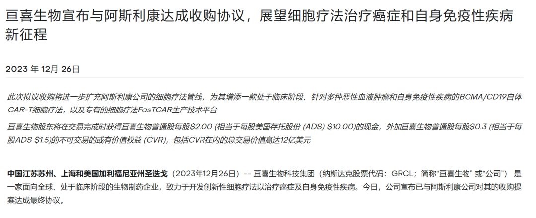今日,阿斯利康已就对亘喜生物科技集团(纳斯达克股票代码:GRCL;简称“亘喜生物”)收购提案签署最终协议,进一步深化阿斯利康在细胞疗法领域布局。亘喜生物是一家面向全球、处于临床阶段的生物制药企业,致力于开发治疗肿瘤及自身免疫性疾病的创新性细胞疗法。