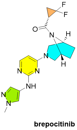 同所有生物制药公司一样,Roivant也同样面对着这个行业很多不可预测因素的左右。他们的子公司之一PRoivant的TYK2/JAK1双抑制剂brepocitinib(图1)在系统性红斑狼疮的3期试验刚刚在11月遭遇了失败。这同样是一个与辉瑞共同开发的药物,在红斑狼疮的项目上愈挫之后,他们决定将继续研究brepocitinib 治疗皮肌炎等孤儿风湿病的疗效。